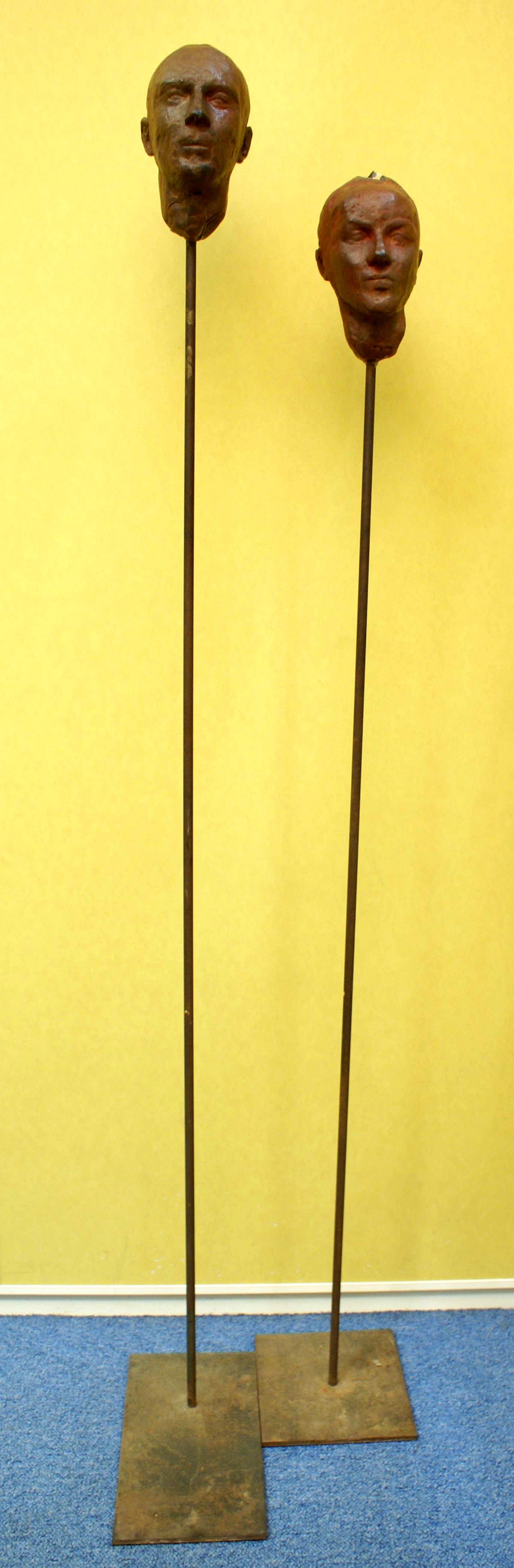 Obra compuesta de dos piezas (cabezas con pedestal) en color imitaciónes de óxido.
