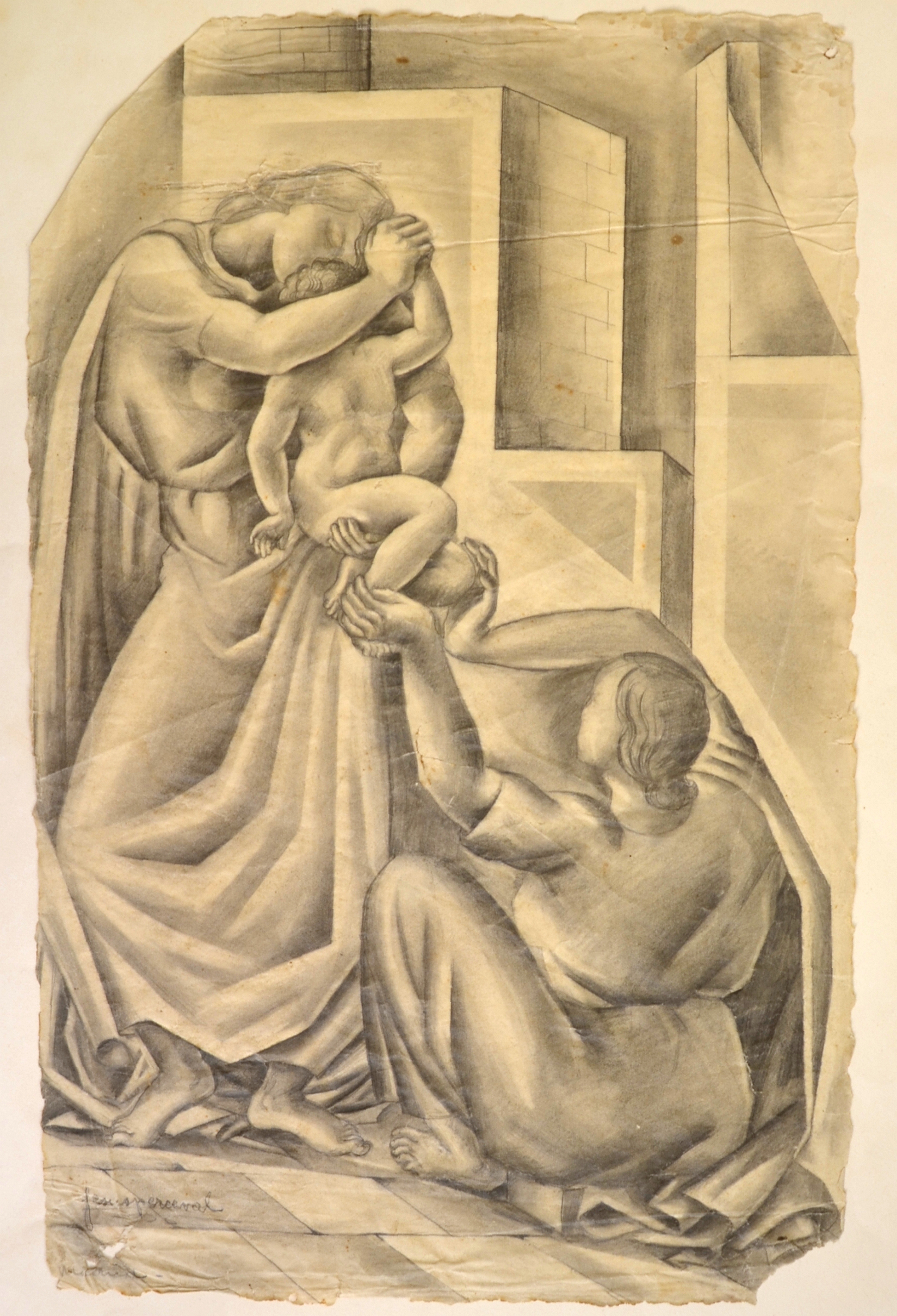 Espléndido dibujo con el estilo más propio y personal de Preceval; se encuentra muy deteriorado en general, sobre todo en los márgenes; incuso ha sido recortado en el margen superior derecho. El haberlo adherido a una cartulina, probablemente, ha permitido que so se haya deteriorado más aún
